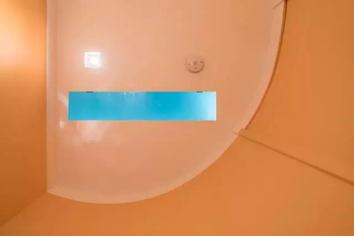 由于客衛四面都不臨窗,考慮到這塊區域的通風和采光,設計師在這一空間的頂部,開了一個長方形的氣窗。
