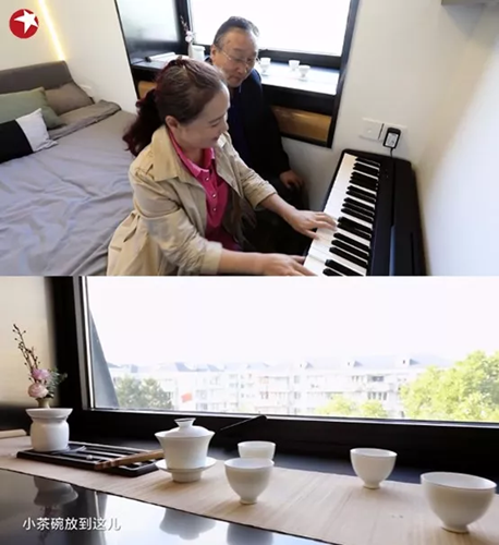 爺爺奶奶的臥室更是別有一番情調,特別為奶奶準備的電子鋼琴,得以滿足奶奶每天早上練琴的習慣,窗臺的茶具也給了爺爺自己鐘情的享樂天地。