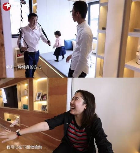 從過去的健身器材無處安放,到現在有了自己的收納箱,讓爸爸每天舉啞鈴鍛煉更方便,設計師還特別在窗臺上設計了一個掛鉤便于拉伸鍛煉,讓爸爸有了更多的健身選擇。媽媽的瑜伽墊也終于有了展開的空間。