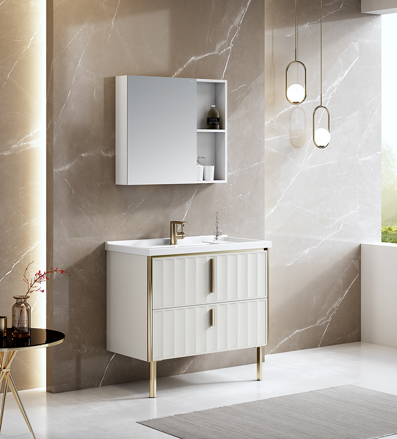 - 幾何波紋柜門搭配簡潔豎型材拉手,加以香檳金裝飾邊點綴。