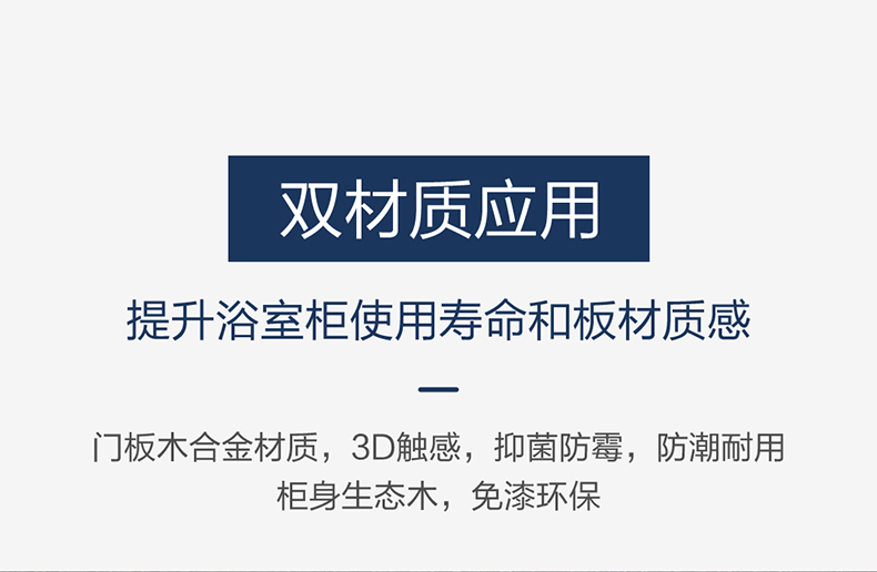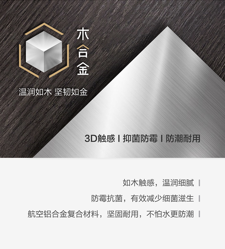 - 2、雙材質應用,門板木合金材質,3D觸感,抑菌防霉,防潮耐用,柜身生態(tài)木,免漆環(huán)保