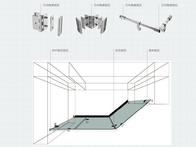 萬向調節系統設計合頁、墻夾、拉桿整體系統均可多角度鎖定,完美解決石基預埋角度不規則,墻面不垂直等一系列現實問題,讓非標淋浴房定制無極限。