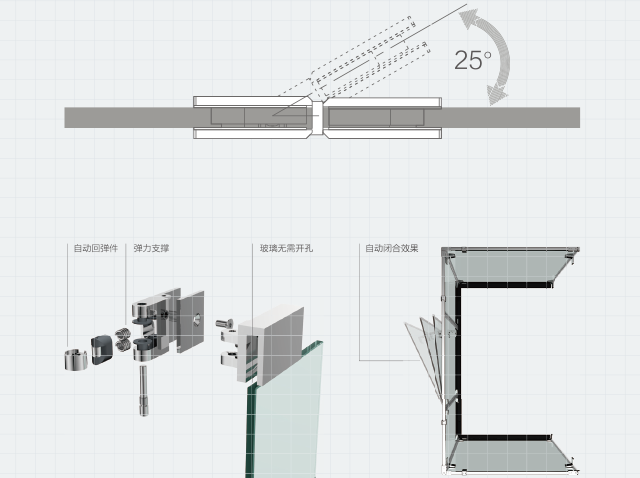 自動閉合門設計25°角自動閉合玻璃門技術,解決了門鉸無法自動閉合所產生的安全銀黃。