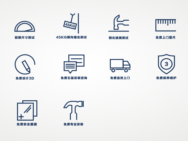 設計安全每套產品從設計之初,我們在結構上、在每一片玻璃的開孔與固定上就全方位的考慮到您的安全,我們要求所有的產品都經過超大、超寬、超窄、45KG橫向撞擊等多項測試,我們對每一片玻璃都進行全鋼化并安全覆膜保護,確保產品結構牢固并經得起外力和時間的考驗。