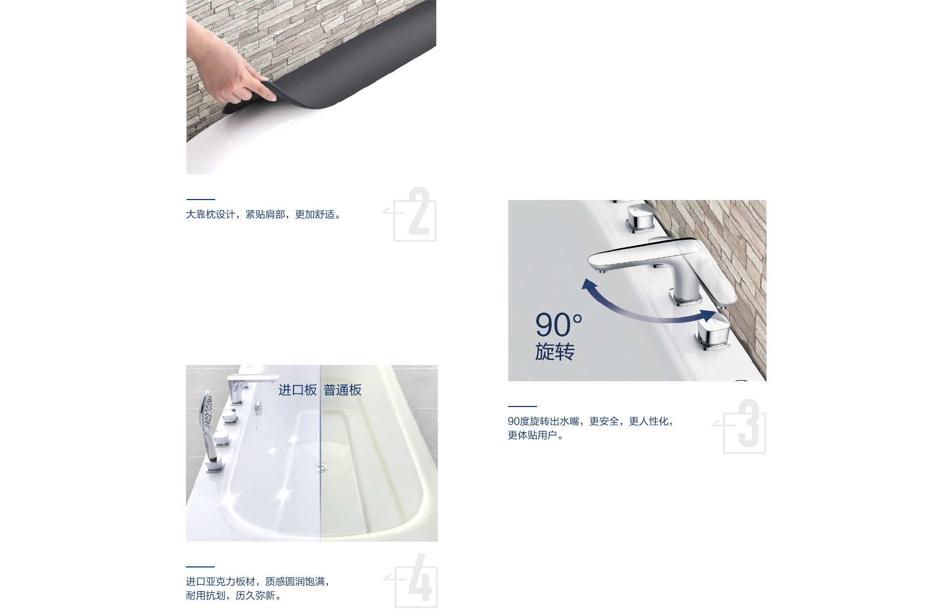 水療獨立按摩系統(tǒng)、勁速沖浪按摩系統(tǒng)、微泡泡按摩系統(tǒng)及汽泡按摩系統(tǒng)四件模式供你選擇,讓你隨心所浴,樂享水悅生活